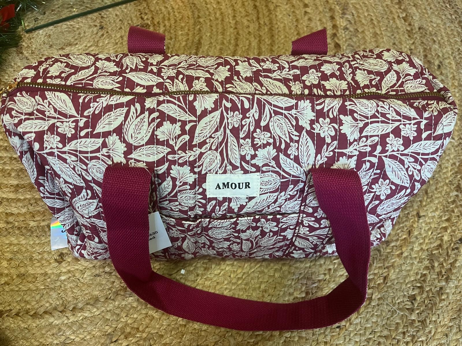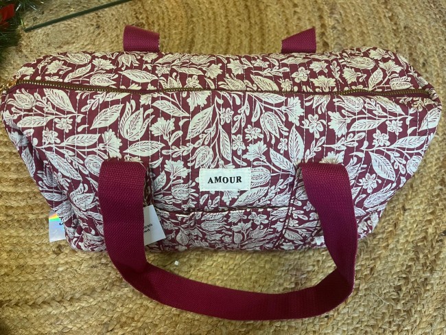 - Sac week-end polochon bordeaux et crème , matelassé ,porté épaule coton imprimé avec zip L 40cm - H 20cm - P 23cm ⁄ en coton matelassé, avec zip par le haut, petite poche devant et poche zippée à l'intérieur.